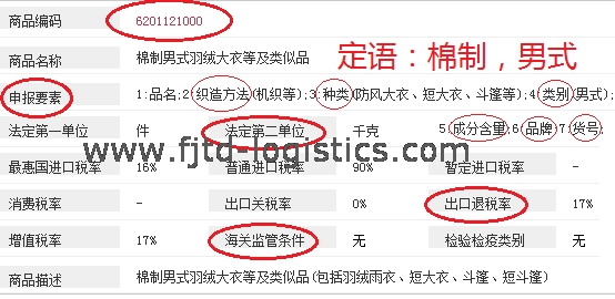 申報要素:織造方法(機織/梭織)、種類(羽絨服)、類別(女式)、成分含量(比如80%棉)、品牌、貨號。法定第一單位:件,法定第二單位:千克。