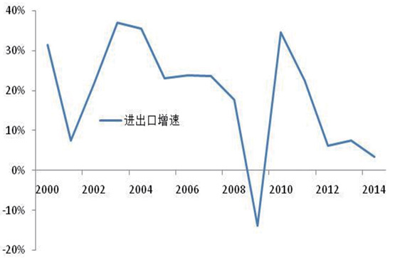 外貿保持穩定增長,與經濟彈性進一步下降。在加入WTO的帶動下,2000-2007年我國外貿進出口總額保持了24.3%的年均增長(如圖8所示),與 GDP的彈性係數高達2.25,明顯高出世界1.5的平均水平,成為世界重要經貿大國。受到金融危機衝擊和全球貿易放緩的影響,麵對國內外複雜形勢,2007-2014年我國對外貿易仍保持較快發展,外貿進出口總額年均增速達到10.2%,國際貿易地位不斷提高,成為世界第一貨物貿易大國。隨著貿易依賴度的提高,進出口彈性逐步下降,由2.25下降為1.16。“十三五”期間我國對外貿易發展將麵臨更加複雜的國際環境,將逐步轉入平穩發展階段,與 GDP的彈性下降為1.0,外貿進出口總額增速保持在6.6%與GDP相當的水平。