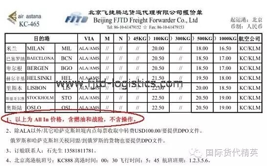 2)以上報價不含燃油附加費和安全附加費,燃油附加費FSC 1.6/KG,安全附加費SCC 1/KG