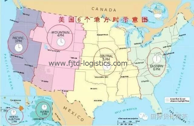 2)美國也是地域遼闊,橫跨6個時區(西五區—西十區),但美國沒有像中國一樣使用統一的“地方時”,而是有6個不同的“地方時”,分別是: