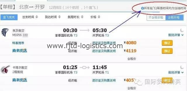 圖中的:00:30(首都國際機場)→05:30(開羅機場)是什麼意思?右上角的“所有起飛/降落時間均為當地時間”如何理解?