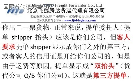 換言之,你出口一票貨物,正常來說,提單委托人(提單shipper抬頭)應該是你們公司,但客人要求提單shipper顯示成你們之外的第三方;或者客人的信用證是開給你們公司的,但是由於運費等原因,提單顯示成“雙抬頭”(貨代公司O/B你們公司)。為什麼有人誤以為貨代提單是第三方提單?因為提單顯示成“雙抬頭”(貨代公司O/B你們公司),其實這不是貨代提單,隻不過是提單顯示成“雙抬頭”(貨代公司O/B你們公司)的第三方提單而已。