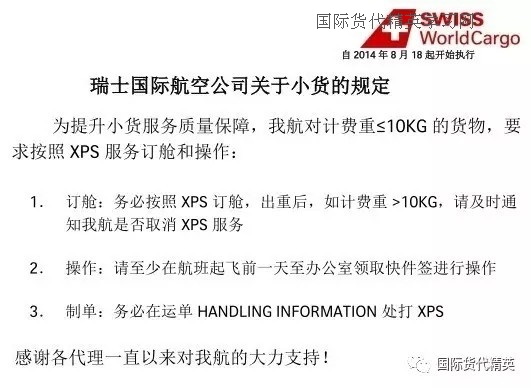 為提升小貨服務質量保障,我航對計費重≤10KG的貨物,要求按照XPS(快件)服務訂艙和操作: