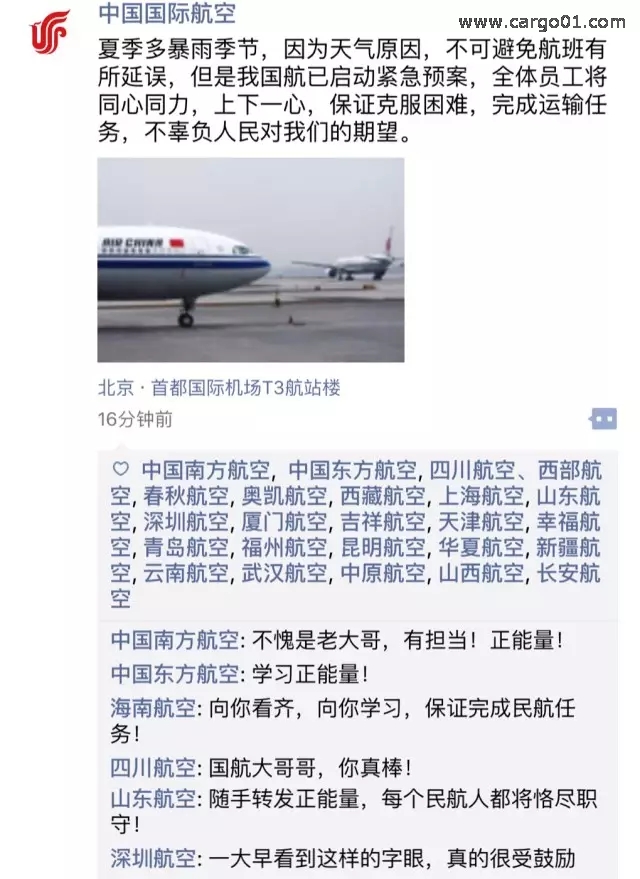 “夏季多暴雨季節,因為天氣原因,不可避免航班有所延誤,但是我國航已啟動緊急預案,全體員工將同心協力,上下一心,保證克服困難,完成運輸任務嗎,不辜負人民對我們的期望”