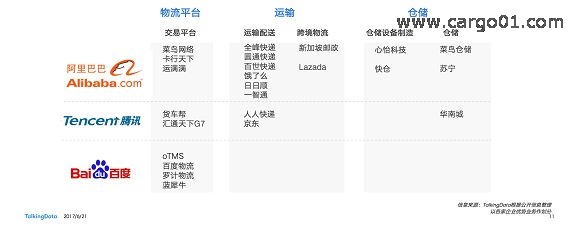 阿(e)裏(li)做(zuo)為(wei)國(guo)內(nei)電(dian)商(shang)的(de)領(ling)軍(jun)廠(chang)商(shang),和(he)物(wu)流(liu)行(xing)業(ye)關(guan)係(xi)較(jiao)為(wei)密(mi)切(qie)。除(chu)搭(da)建(jian)菜(cai)鳥(niao)網(wang)絡(luo)物(wu)流(liu)平(ping)台(tai)外(wai),在(zai)運(yun)輸(shu)和(he)倉(cang)儲(chu)領(ling)域(yu)也(ye)積(ji)極(ji)布(bu)局(ju)。騰(teng)訊(xun)從(cong)投(tou)資(zi)數(shu)量(liang)來(lai)看(kan)不(bu)如(ru)阿(e)裏(li),但(dan)也(ye)已(yi)經(jing)覆(fu)蓋(gai)了(le)物(wu)流(liu)平(ping)台(tai)、倉儲和運輸三大版塊;百度目前以投資物流平台為主。