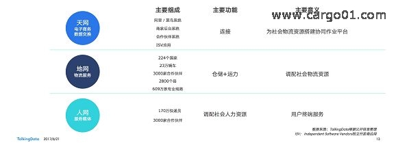 菜鳥物流網可拆分成天網、地網和人網3大版塊。天網是由數據驅動的雲供應鏈協同平台,強調電子商務及物流數據的交互和分享;地網是借由龐大的地麵網絡不斷聚集貨物、人氣,讓天網的數據能力落地;人網是主打“最後一公裏”物流服務和基於消費者真實生活中各種場景下的便民服務。