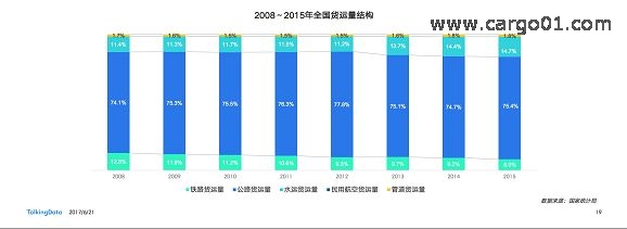 公路運輸因yin其qi運yun輸shu的de機ji動dong性xing,網wang絡luo的de廣guang泛fan覆fu蓋gai等deng特te點dian,一yi直zhi是shi多duo數shu貨huo運yun的de首shou選xuan,隨sui著zhe市shi場chang規gui模mo的de不bu斷duan擴kuo大da,基ji礎chu設she施shi也ye不bu斷duan完wan善shan,使shi得de公gong路lu運yun輸shu長chang期qi占zhan據ju貨huo運yun量liang的de75%左右;鐵路運輸份額持續下降,水運貨運持續上升。