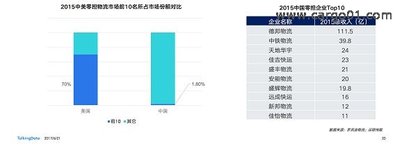 中國公路運輸的企業有78萬家,“小”“散”“亂”“差”是行業最主要的問題。他們經常表現為一人一車一電話的作坊模式。中國零擔市場前10名市場份額之和占行業整體的1.8%,美國零擔市場前10市場份額之和卻高達70%。頭部廠商的市場份額大,有利於充分調配資源,達到降低成本提升效率的目的。