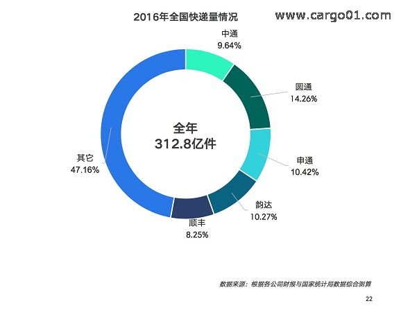 以順豐、圓通、申通、中通和韻達主導的快遞行業,已形成了自己的市場格局。2016年快遞市場Top 5企業的業務量占據了中國快遞總體業務量的一半以上。