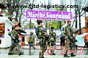 當地時間20115年11月25日,法國巴黎,軍警駐守香榭麗舍大街聖誕市場。巴黎這處原本紅火的聖誕市場,顯得有些冷清。