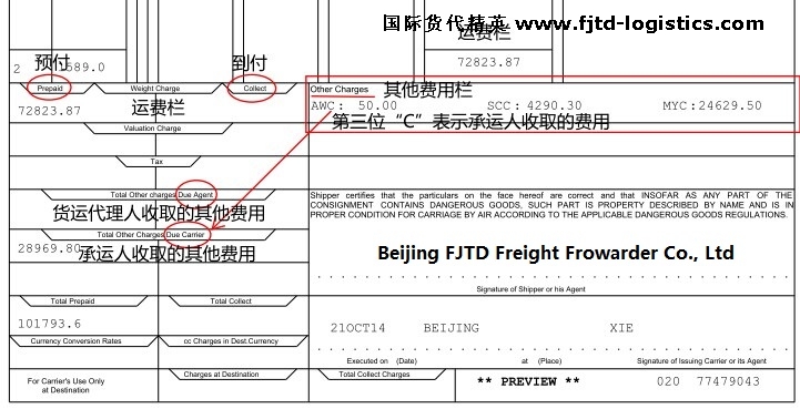 此欄目顯示除運費之外的所有其他費用,顯示形式為三個字母組成的代碼——前兩個字母是費用代碼,第三個字母要麼是“C”要麼是“A”,用以區分費用歸屬——“C”表示歸屬承運人Carrier,“A”表示歸屬於貨運代理Agent。