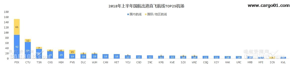 2018年上半年國航出港直飛航線TOP25機場中,有一個國外機場(首爾仁川,7條出港直飛航線)。