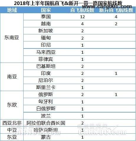 相比2017年上半年,國航新開8條直飛“一帶一路”沿線國家航線,其中新開直飛東南亞地區航線6條,南亞、東歐地區分別新開1條直飛航線。