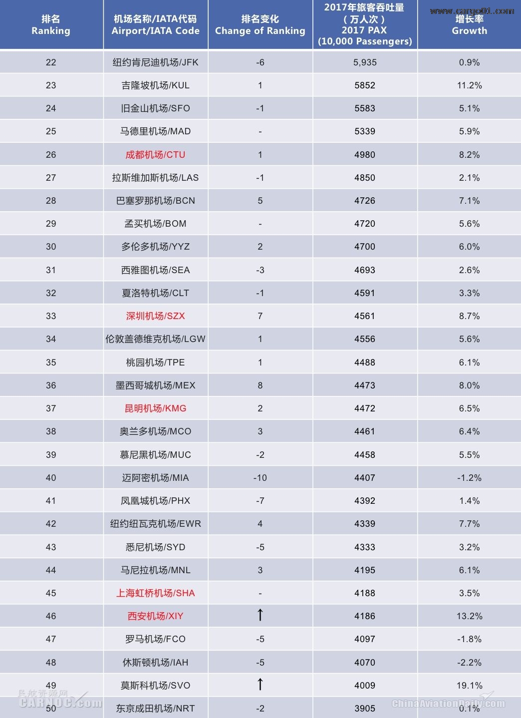 CADAS:2017年全球機場吞吐量TOP50出爐