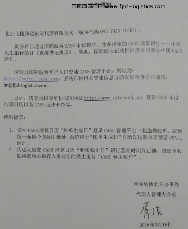貴公司已通過國際航協CASS審核程序,並在指定的CASS清算銀行——中國民生銀行簽訂《直接借記協議》。