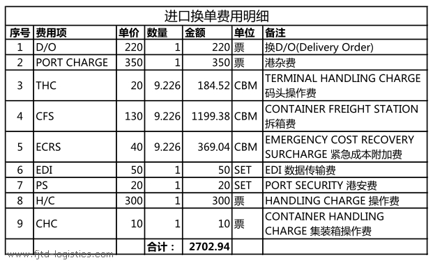 不同貨代,進口換單費千差萬別。進口貨代發給收貨人的對賬單上通常包括:換D/O費、THC費、數據傳輸費、文件費、港雜費、港安費、拆箱費、操(cao)作(zuo)費(fei)等(deng)。有(you)的(de)貨(huo)代(dai)會(hui)給(gei)一(yi)個(ge)費(fei)用(yong)明(ming)細(xi),有(you)的(de)貨(huo)代(dai)隻(zhi)給(gei)一(yi)個(ge)總(zong)費(fei)用(yong)。給(gei)費(fei)用(yong)明(ming)細(xi)的(de)好(hao)理(li)解(jie),給(gei)總(zong)費(fei)用(yong)的(de),作(zuo)為(wei)收(shou)貨(huo)人(ren)一(yi)般(ban)都(dou)不(bu)知(zhi)道(dao)具(ju)體(ti)有(you)哪(na)些(xie)費(fei)用(yong),更(geng)要(yao)命(ming)的(de)是(shi)給(gei)一(yi)個(ge)總(zong)費(fei)用(yong)不(bu)要(yao)緊(jin),且(qie)費(fei)用(yong)名(ming)稱(cheng)就(jiu)叫(jiao)“換單費”,這時候收貨人會被“嚇到”——換單費怎麼那麼高?筆者就遇到國這種情況,結果一問,才知道所謂的換單費竟然包括了如下一大堆費用: