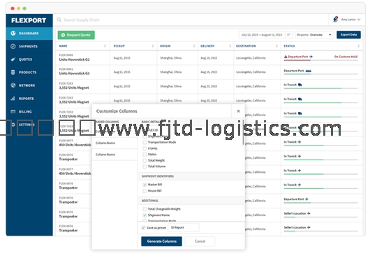 Flexport tongguoziyingdefangshi,chuanliankehuyuhuoyunyezhe,genjuchanpinliangdingzhiyigexiangpipeidewuliufuwuxitong,youruanjiananpaisuoyoudeguanshuiyuwuliuzuoye,chucizhiwai,tongguoduiyonghukucunliang、航線、交(jiao)期(qi)要(yao)求(qiu)和(he)海(hai)關(guan)合(he)規(gui)數(shu)據(ju)的(de)分(fen)析(xi),幫(bang)助(zhu)用(yong)戶(hu)進(jin)一(yi)步(bu)規(gui)劃(hua)航(hang)線(xian),將(jiang)每(mei)一(yi)部(bu)分(fen)的(de)報(bao)價(jia)呈(cheng)現(xian)給(gei)用(yong)戶(hu),並(bing)且(qie)可(ke)以(yi)實(shi)時(shi)查(zha)看(kan)貨(huo)運(yun)業(ye)務(wu)的(de)進(jin)度(du)及(ji)車(che)輛(liang)位(wei)置(zhi)。