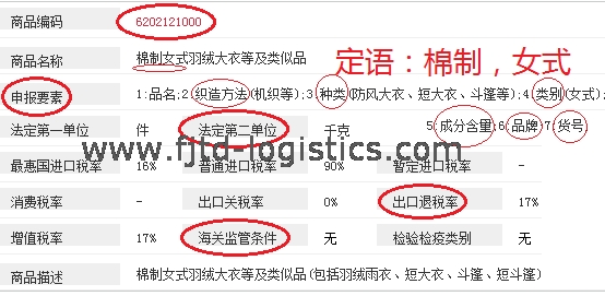申報要素:織造方法(機織/梭織)、種類(羽絨服)、類別(女式)、成分含量(比如80%棉)、品牌、貨號。法定第一單位:件,法定第二單位:千克。
