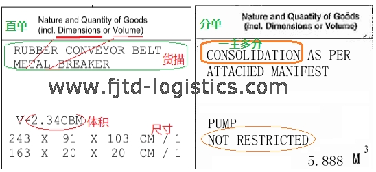 Consol和consolidation意思差不多,都是表示“混載”“拚裝”,一般可以通用。如果一個航空主單(MAWB)對應多個航空分單(HAWB),且貨物種類較多,就會在主運單“貨物描述”(Nature and Quantity of Goods(incl. Dimensions or Volume))那裏打上“Consol”字樣。如果一個主運單對應多個分單,但是品名隻有一個,可以不打“Consol”字樣,隻需要打該貨物的實際品名也可以。