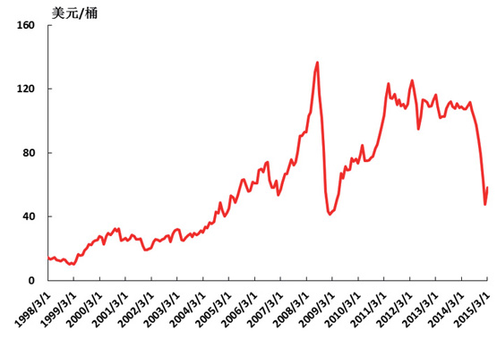 大宗資源類價格進入一輪低穀。在上一輪世界經濟快速增長的帶動下,對石油、鐵礦石等資源類商品需求快速增長,天平向供給方傾斜,推動了資源價格大幅度上漲(如圖3和圖4所示),同時也刺激資本對資源開發、生產投入大幅度增長。在世界經濟增速放緩、生sheng產chan率lv效xiao率lv持chi續xu提ti高gao和he日ri益yi注zhu重zhong節jie能neng減jian排pai的de背bei景jing下xia,需xu求qiu減jian弱ruo,而er產chan出chu穩wen定ding增zeng長chang,供gong需xu關guan係xi出chu現xian了le失shi衡heng,天tian平ping向xiang需xu求qiu方fang傾qing斜xie,資zi源yuan價jia格ge開kai始shi大da幅fu下xia跌die。石shi油you價jia格ge一yi度du跌die至zhi40多美元,中國鐵礦石到岸價也跌至60-70美元的水平(如圖3和圖4所示)。從多個機構的預測來看,今後一個時期大宗商品價格很難有大幅提升。