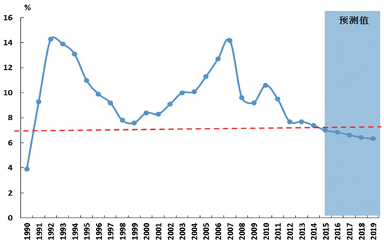 經濟進入中速增長階段。圖5顯示了1990年以來我國經濟增速的變化。2000-2010年我國經濟、對外貿易分別保持了年均10.5%和20.2%的增長,2010年後呈現逐步放緩態勢,2014年降為7.4%。當前,我國經貿發展麵臨十分複雜的國際環境,內部則處於“三期”疊加期。隨著新型工業化、信息化、農業現代化和城鎮化“新四化”的不斷推進,以及市場機遇、投資機遇、lvsejiyuheduiwaihezuojiyudebuduankuoda,weiwoguojingjizengchangtigonglejudaqianlihehuixuankongjian。zhexiefazhanhuanjingbianhuashiwoguojingjifazhanjinruxinchangtai,yuji2015年GDP增長約7%,“十三五”期間經濟平均增速隻要保持在6.6%(如圖5所示),即可實現 2020年GDP總量比2010年翻一番的戰略目標,按照人均GDP水平測算,我國將進入高收入國家行列,對海運需求質量將全麵提高。