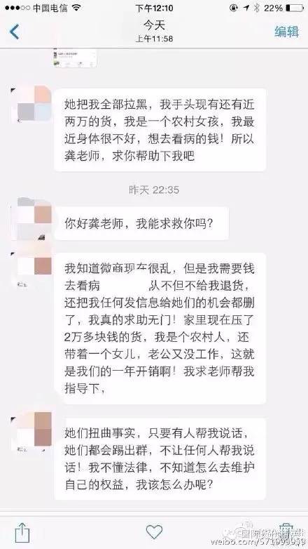 今jin日ri,有you一yi位wei做zuo微wei商shang的de寶bao媽ma向xiang知zhi名ming電dian商shang自zi媒mei體ti人ren龔gong文wen祥xiang求qiu救jiu,她ta說shuo自zi己ji做zuo微wei商shang屯tun了le兩liang萬wan元yuan的de貨huo,而er自zi己ji又you來lai自zi農nong村cun,兩liang萬wan元yuan的de貨huo款kuan相xiang當dang於yu自zi己ji一yi年nian的de開kai銷xiao了le。自zi己ji最zui近jin生sheng病bing了le,可ke是shi她ta之zhi前qian加jia入ru的de團tuan隊dui,卻不願意給她退款。真可謂是欲哭無淚啊,詳細內容看下麵的圖片:
