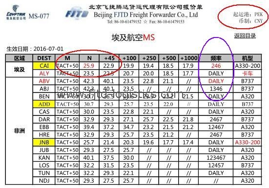 如MS運價表中,ALY對應的頻率是“Daily”,機型是“卡車”。神馬意思?正確理解是:PEK-ALY的頭程是空運——PEK直飛CAI;二程(續程)是陸運——在CAI中轉,用卡車運到目的地ALY。不是空運中轉,而是卡車中轉。這裏的“Daily”不是指PEK-CAI或PEK-ALY每天都有航班,而是指CAI-ALY每天都有卡車。你Get到了嗎?