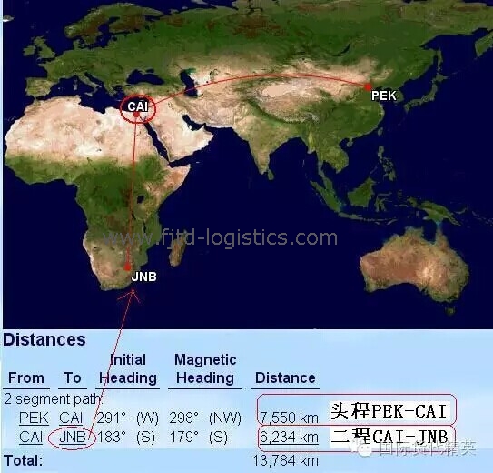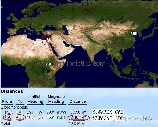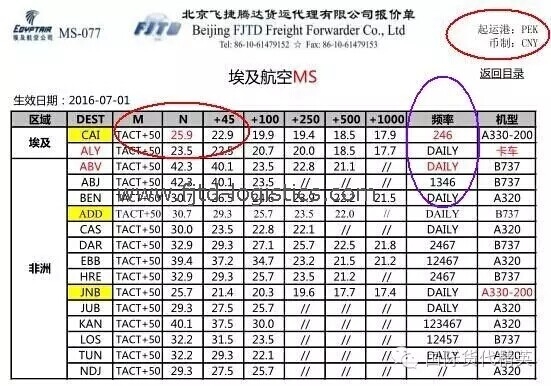 運價表中CAI、ALY、ADD、JNB…對應的價格,是北京到各點的全程運價(PEK-CAI、PEK-ALY、PEK-ADD、PEK-JNB…),含中轉和二程費用。其中,PEK-CAI是直飛,PEK-其他機場則是在CAI中轉。