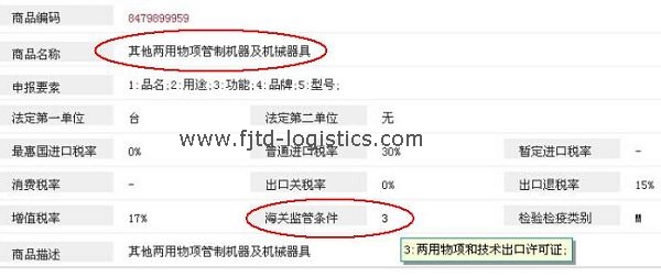 2. HS編碼8479899959其他兩用物項管製機器及機械器具——海關監管條件還有——兩用物項和技術出口許可證(代碼3)