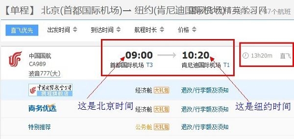 為什麼總飛行時間是“13h20m”?因為北京時間和紐約時間的時差是12小時——紐約時間比北京時間晚(慢)12個小時。於是,12個小時+(10:20-09:00)=13小時又20分鍾。