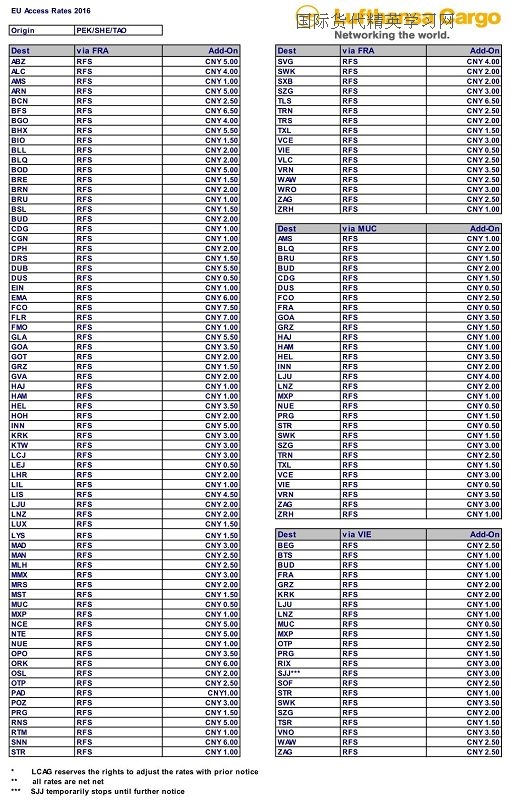 附:LH漢莎航空 中轉點-轉運費一覽表