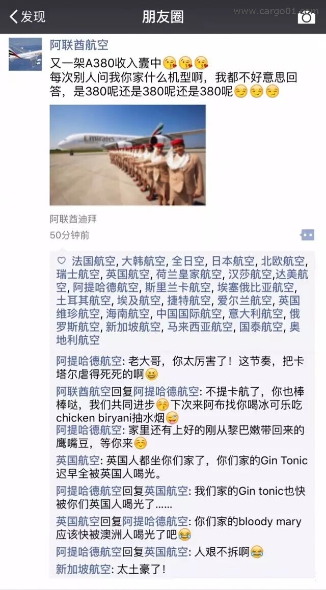 意大利航空、柏林航空、塞爾維亞航空、意大利航空、愛爾蘭航空、澳州維珍航空、印度捷特航空——阿提哈德收購的幹兒子們,都統一的神回複“阿提哈德爸爸,真棒~”,真是讓人忍俏不禁啊!