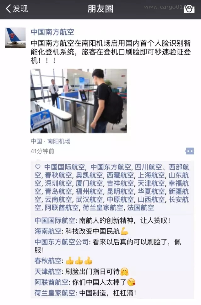 “中國南方航空在南陽機場啟用國內首個人臉識別智能化登機係統,旅客在登機口刷臉即可秒速驗證登機!!!”