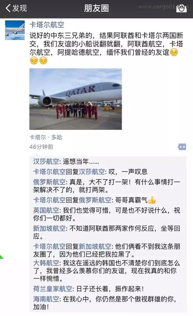 “說好的中東三兄弟的,結果阿聯酋和卡塔爾兩國斷交,我們友誼的小船說翻就翻,阿聯酋航空,卡塔爾航空,阿提哈德航空,緬懷我們曾經的友誼。”