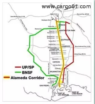 阿拉米達貨運走廊是一條長為32公裏的鐵路重載運輸通道,連接長灘港、洛杉磯港與美國國家鐵路網的快速貨運通道。在洛杉磯雷東多聯軌站並入鐵路網,其中有16公裏的溝塹式通道(地下10米深的溝槽,可通行雙層集裝箱列車)和大量立體交叉。總投資24億美元,采取公私合營PPP形式。其中國家投資11.65億美元,港口各公司集資3.94億美元,洛杉磯交管部門撥付3.47億美元,其他州或聯邦政府注資1.54億美元,還向政府貸款4億美元。2002 年項目竣工並投入運營, 極大地提升了洛杉磯港的集疏運能力和運轉效率。