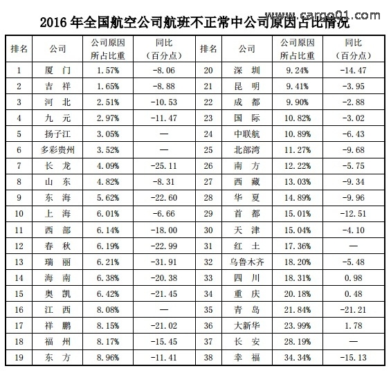 2016年航班正常率顯著提高 航空公司原因延誤占比下降近10個百分點