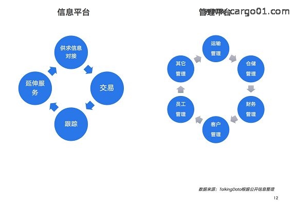 物wu流liu平ping台tai分fen為wei兩liang類lei,信xin息xi平ping台tai和he管guan理li平ping台tai。信xin息xi平ping台tai分fen為wei物wu流liu信xin息xi查zha詢xun平ping台tai和he物wu流liu信xin息xi交jiao易yi平ping台tai。查zha詢xun平ping台tai主zhu要yao以yi物wu流liu信xin息xi查zha詢xun和he發fa布bu為wei主zhu,交jiao易yi平ping台tai在zai查zha詢xun平ping台tai的de基ji礎chu上shang增zeng加jia買mai賣mai雙shuang方fang直zhi接jie交jiao易yi功gong能neng,並bing且qie在zai買mai賣mai雙shuang方fang交jiao易yi全quan程cheng提ti供gong配pei套tao服fu務wu。 管理平台的主體通常是企業主,管理平台的作用主要是合理調配資源、提高效率等。