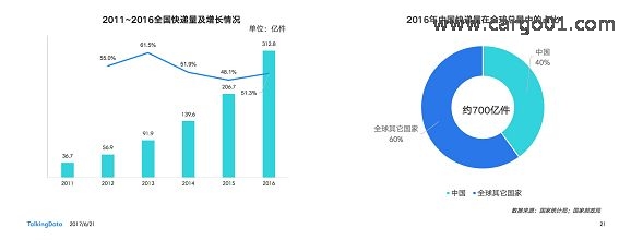 2011年~2016年,中國快遞行業持續以50%左右的增長率高速增長,目前已成為世界第一快遞大國。2016年全球700億件快遞中,中國貢獻300億件,占比40%左右,快遞業總收入也首破4000億大關。