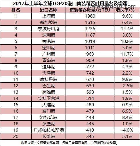 近期,中國港口協會發布了2017年上半年全球港口集裝箱吞吐量20強榜單。