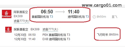 如圖,北京(Beijing - PEK)到迪拜(Dubai - DXB)的航班信息,出發時間(Departure Time)是06:50,到達時間(Arriving Time)11:40。乍一看,你會不會覺得奇怪,北京飛迪拜怎麼隻用了不到4個小時?但是上麵明明寫著飛行時長8小時50分呀。
