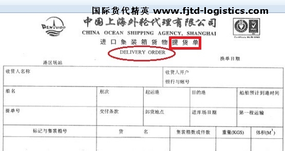 D/O是Delivery order的首字母簡稱,意思為提貨單,因為進口時才有,也叫進口提貨單,常見的是進口集裝箱貨物提貨單。如圖: