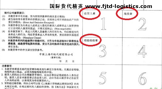如圖:第一個格子蓋收貨人章,第二個格子蓋海關章,第三個格子蓋檢驗檢疫章……還有幾個格子,普通貨物一般用不到,是預留給特殊貨物的。隻有在檢疫、報關等必要手續都完成之後,收貨人才可以提到貨。比如,如果沒有海關章(意味著報關還沒完成,海關還沒放行),收貨人是提不走貨物的。