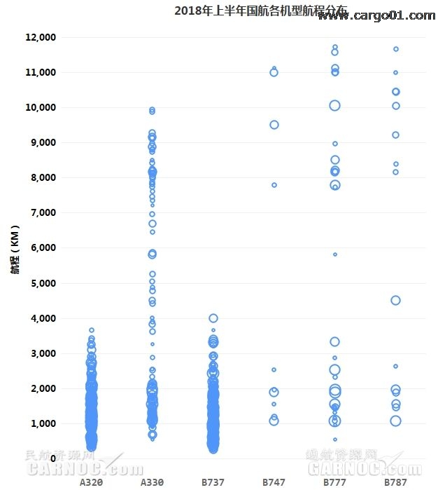 A330係列機型航程分布範圍較廣,平均航程3482km。執飛航班70.4%的航程在1500km以上;31.1%的航班航程在4000km以上。B777、B787係列機型平均航程分別為4699km、4816km,30%的航班航程在8000km以上。