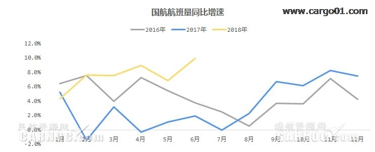 2016年以來,國航執飛航班量在波動中上升,從近兩年表現來看,下半年增速較為穩定,相比前兩年,2018年上半年增速有所提升且更為穩定。