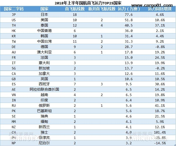直飛日本運力最多,為77.6萬座,同比增加4.6%,直飛日本航線18條,相比2017年上半年,無新開直飛日本航線。