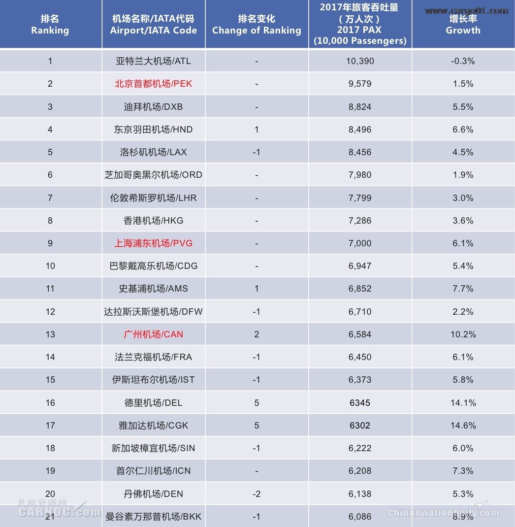 2017年全球6000萬級以上機場達到21座,相較去年增加7座,德裏機場與雅加達機場排名各上升5位,其餘機場排名無較大變化。