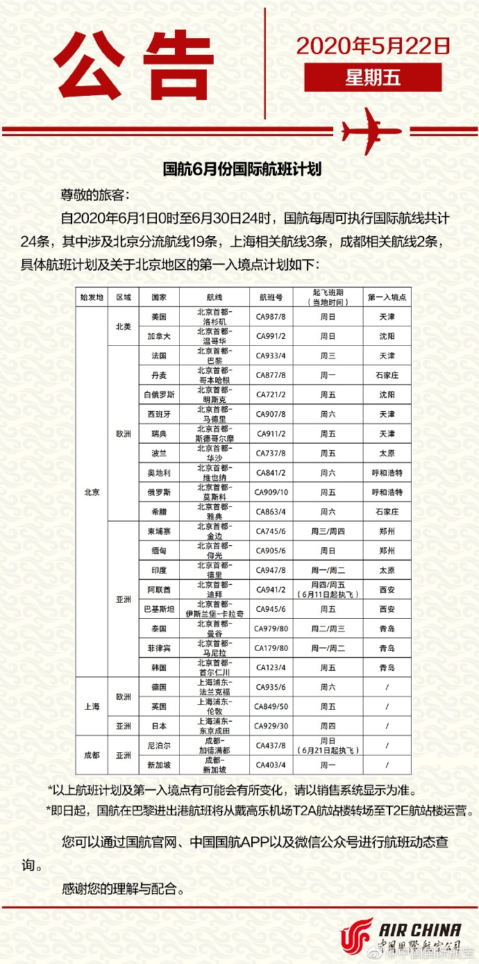 自2020年6月1日0時至6月30日24時,國航每周可執行國際航線共計24條,其中涉及北京分流航線19條,上海相關航線3條,成都相關航線2條,具體航班計劃及關於北京地區的第一入境點計劃如下。